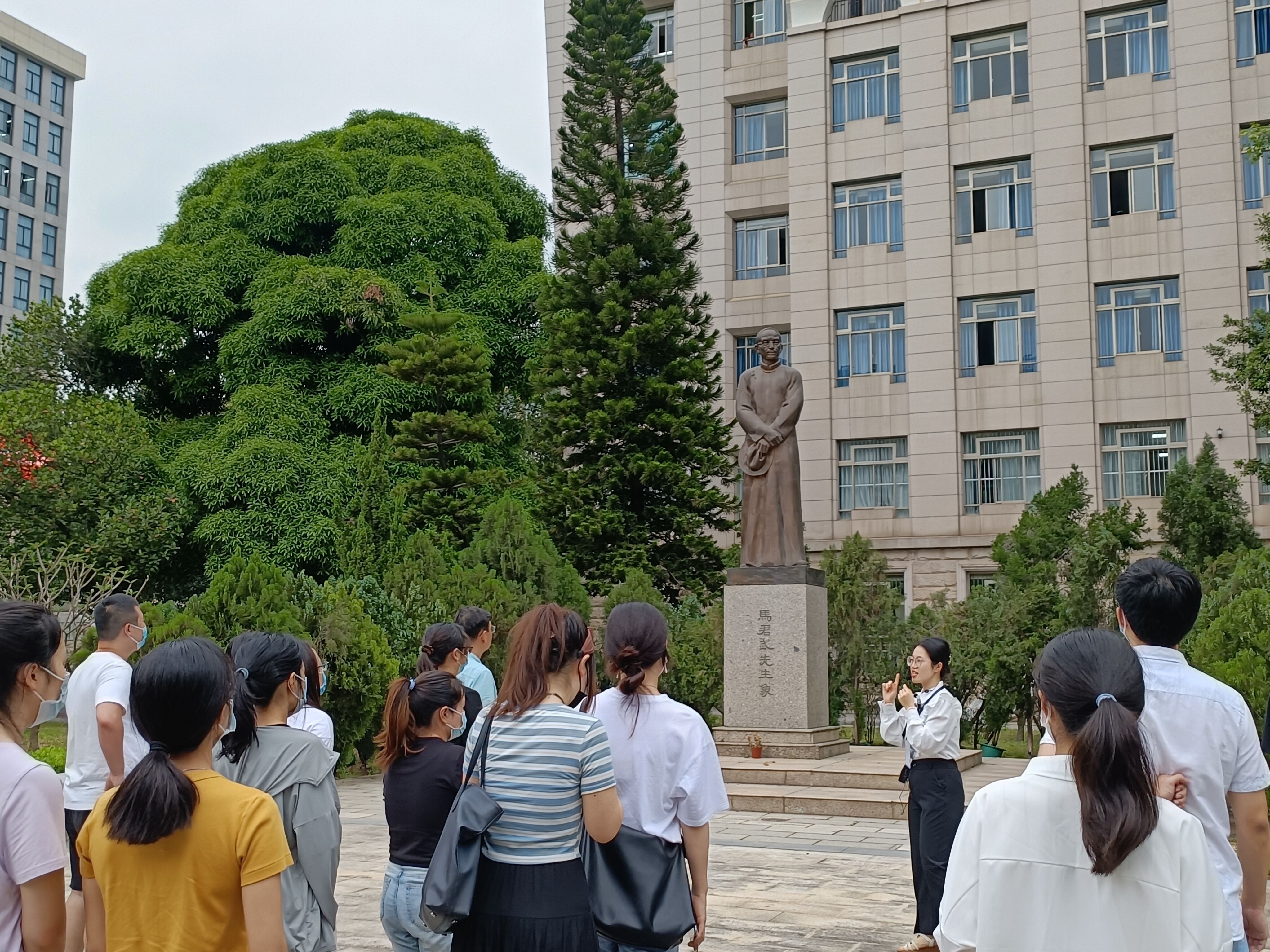 活动开始,跟随宣讲人的步伐,我们来到了广西大学的时光轴,回顾学校百年征程路。从梧州创办到曲折复兴,从热血基业到八桂学府,西大每一步的成就,离不开无数先贤的开创拼搏。一幕幕浮雕,记载那一段段峥嵘岁月。随后,队伍参观了君武园、大师园。君武园中,马君武校长的雕塑矗立中心,他目视前方,仿佛在思考……马君武校长是广西大学第一任校长,也是我国著名的教育家、科学家和民主革命家,中国第一位留德工学博士,中国同盟会的第一批盟员,被誉为“一代宗师”,教育界的“北蔡南马”。这些承载着西大文化传承和精神气质的雕塑作品,滋润和涵养师生们的思想和心灵。同学们感触颇深,边参观边拍照留念。