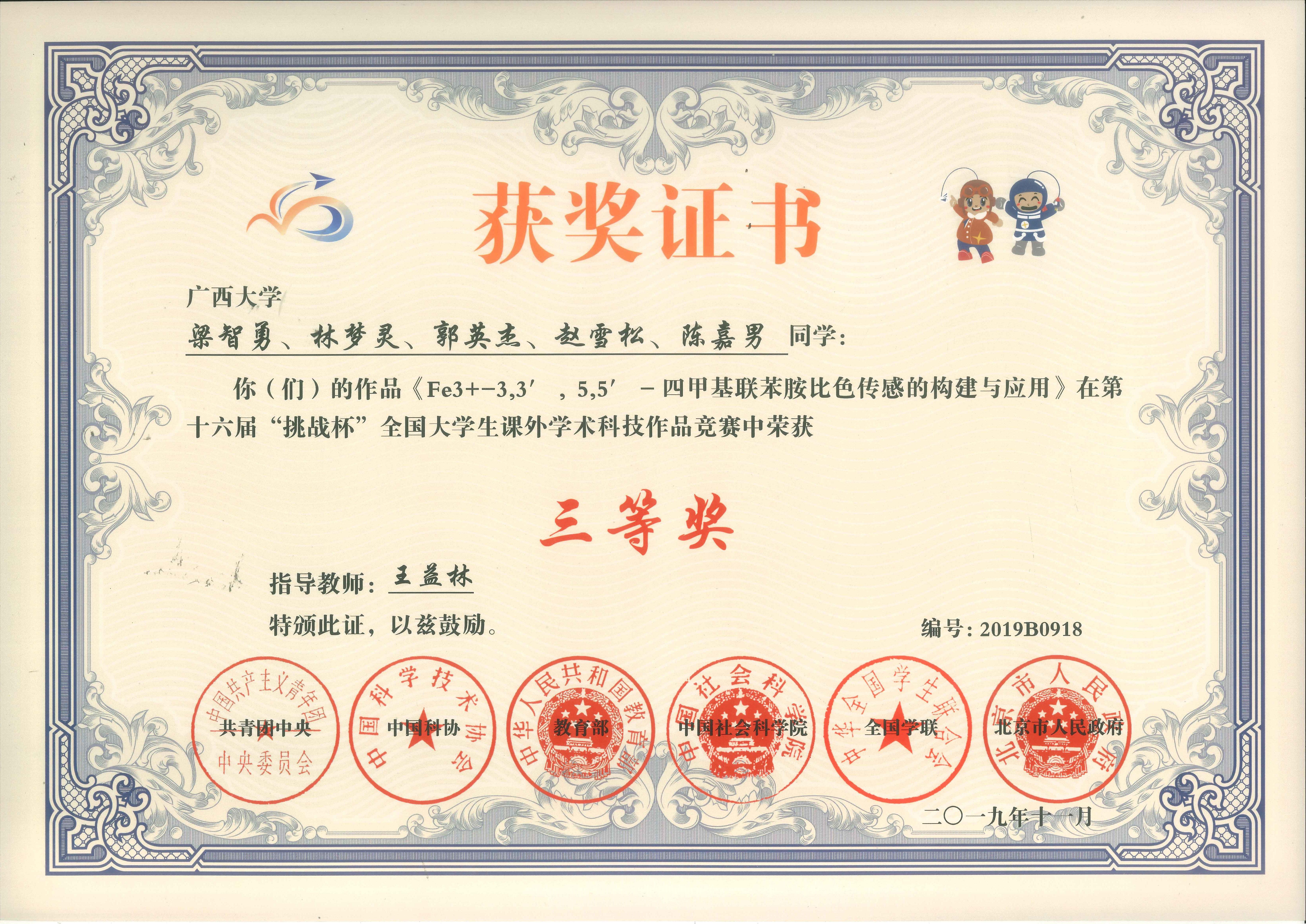 古天乐代言太阳集团网址学生荣获第十六届“挑战杯”全国大学生课外学术科技作品竞赛全国三等奖