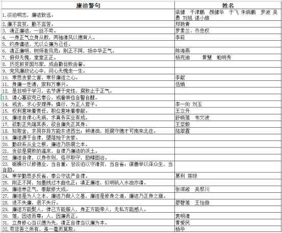 学院党委根据学院廉政风险特点,精选提炼出32条廉洁警示语,全院教职工通过在线选取适合个人风格的警示语,查阅他人选取的警示语等方式对廉洁文化进行学习交流。学院党委将廉洁警示语与姓名牌结合制成个人警示牌,展示摆放在办公桌面显著位置,起到自我警醒、自我监督的作用,促进学院形成“无私奉献、廉洁从教、廉洁育人”的良好教育氛围。老师们表示,通过亮牌活动进一步增强了以身作则、依法执教的意识。