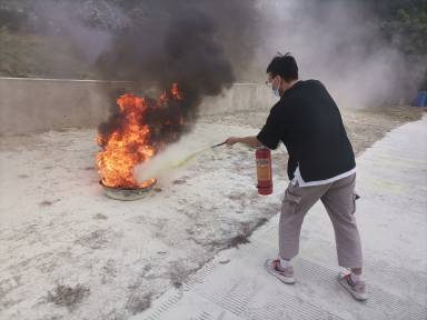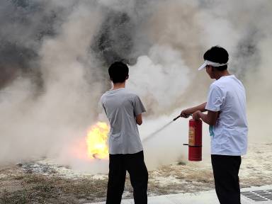 为了让同学们牢记消防知识,本次活动还进行了消防演练实践活动。大草坪前依次摆放了金属盆,盆里装着水、柴油、汽油的混合燃料,每个金属盆前放着红色的灭火器。同学们轮流使用灭火器进行灭火。