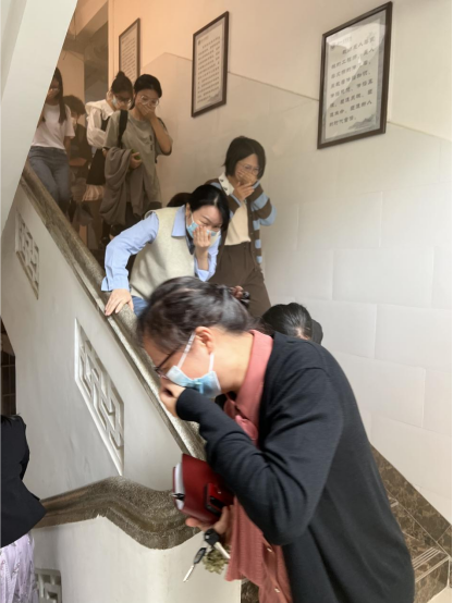 宣讲培训结束后在学院办公楼开展消防疏散演练。学院师生用手捂着口鼻、弯腰扶墙沿楼梯撤离,疏散及时有序,达到了演练效果。
