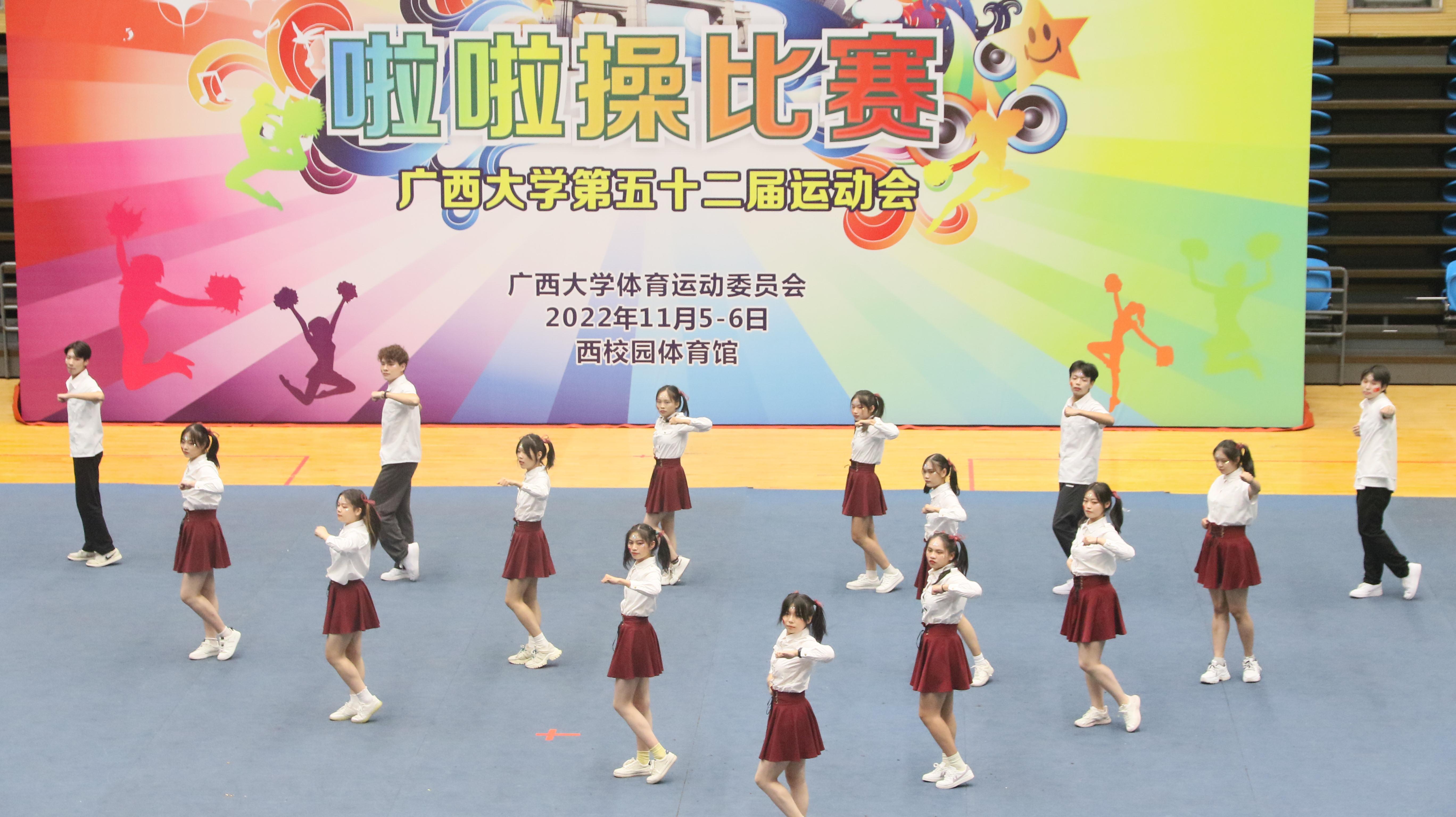 11月6日下午,广西大学第五十二届运动会啦啦操比赛在西体育馆举行。来自24个学院的队伍陆续上场,以同样的激情和不一样的风采赢得了观众们的一阵阵掌声,展现了同学们积极阳光,健康向上,朝气蓬勃,意气风发的良好风貌。