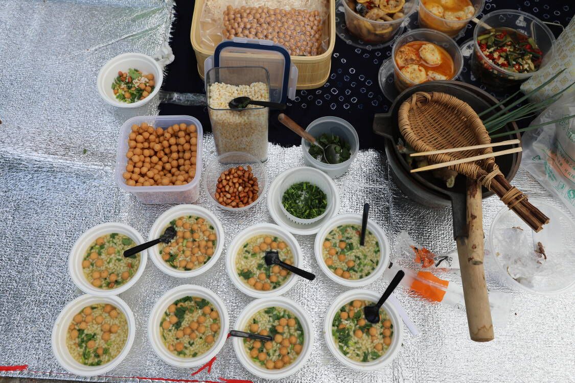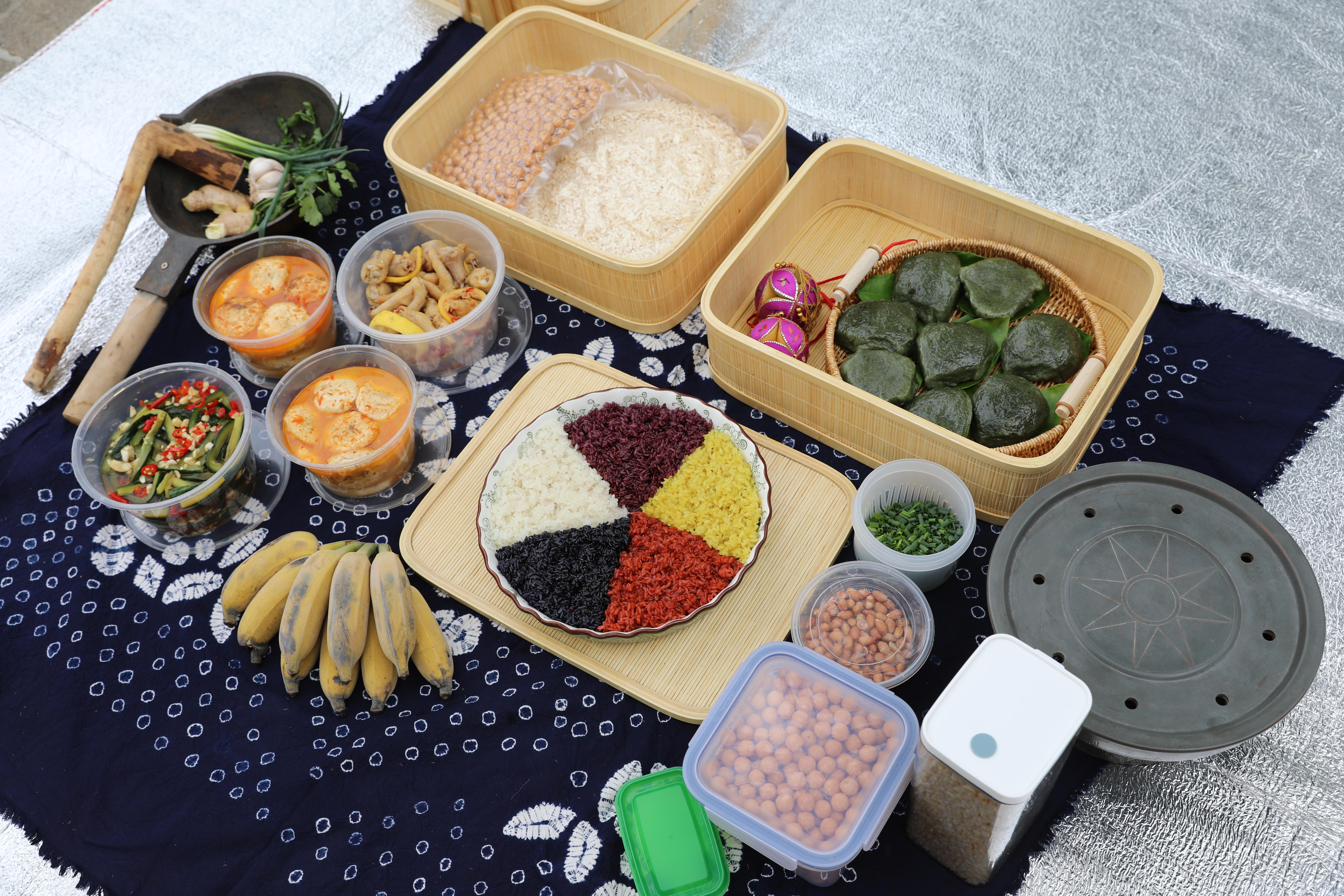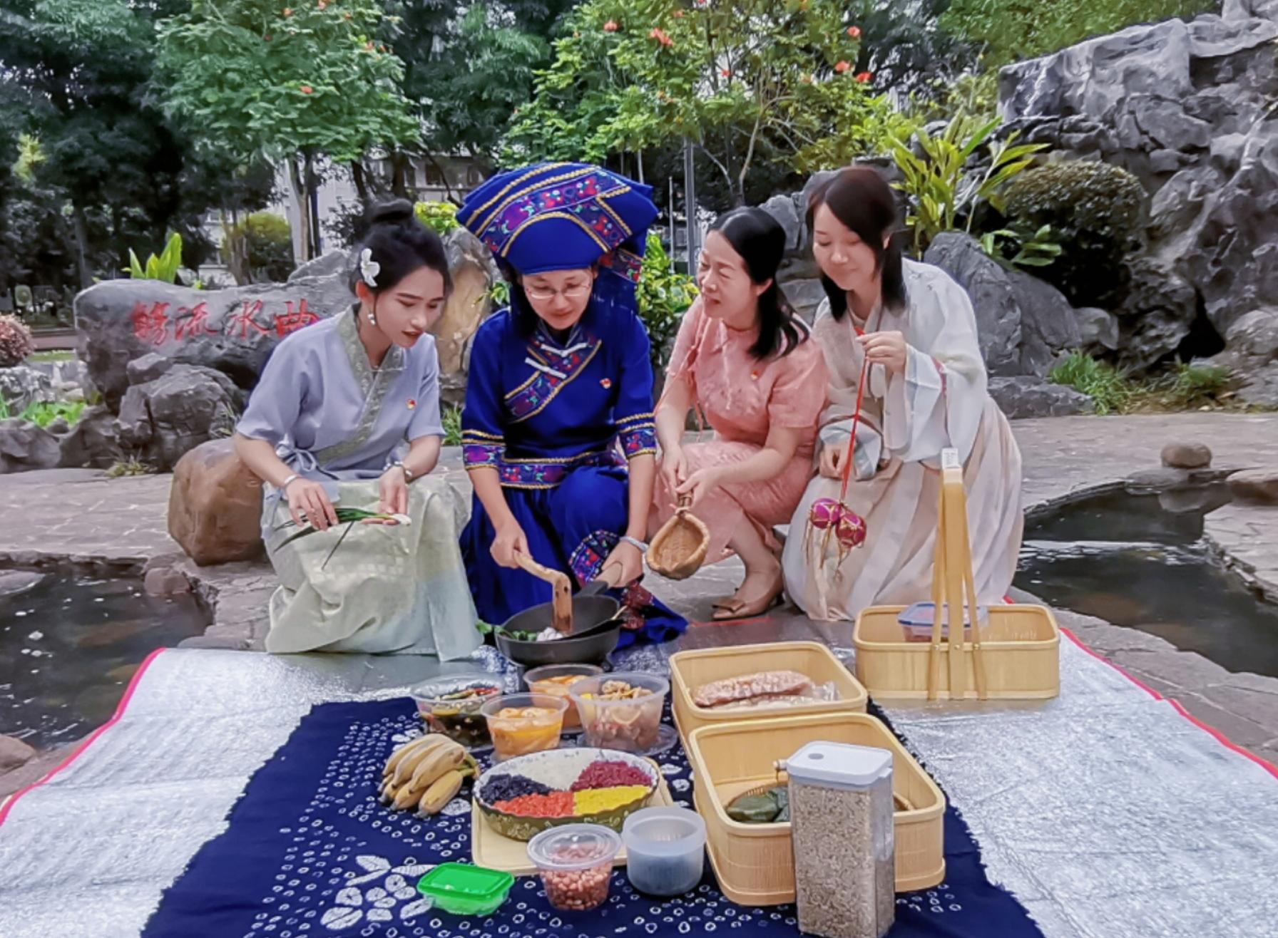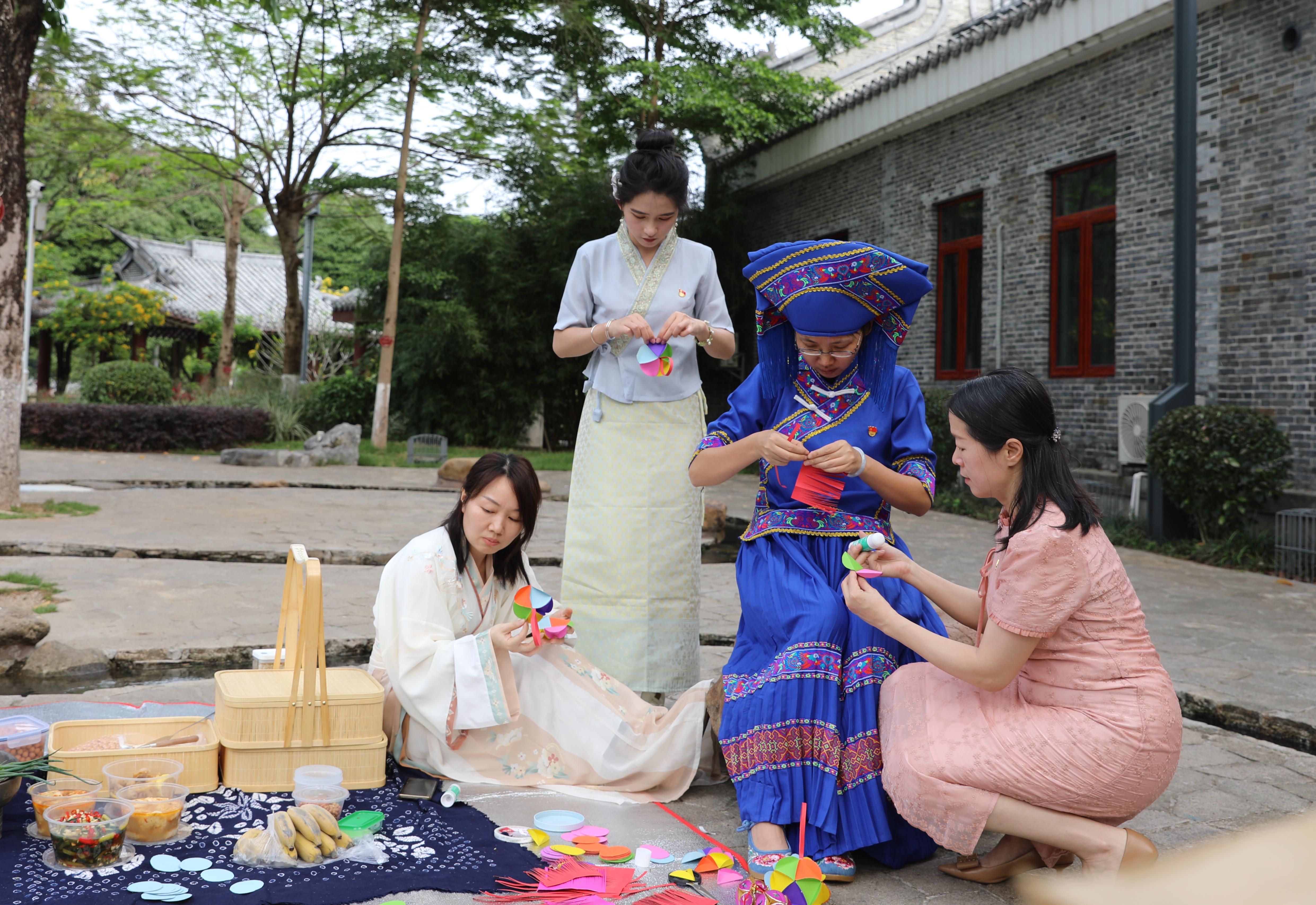 活动中,大家将亲手制作的手打油茶、五色糯米饭、艾叶粑粑、豆腐园、柠香鸡爪和凉拌黄瓜等民族特色美食端上餐垫。朴素的食材和灵巧的双手相遇,把民俗特色和民族风味展现得淋漓尽致。为了充分展现团队的凝聚力和创造力,大家分工合作用彩色卡纸制作绣球,不一会儿,两只多彩立体的绣球就呈现在眼前。