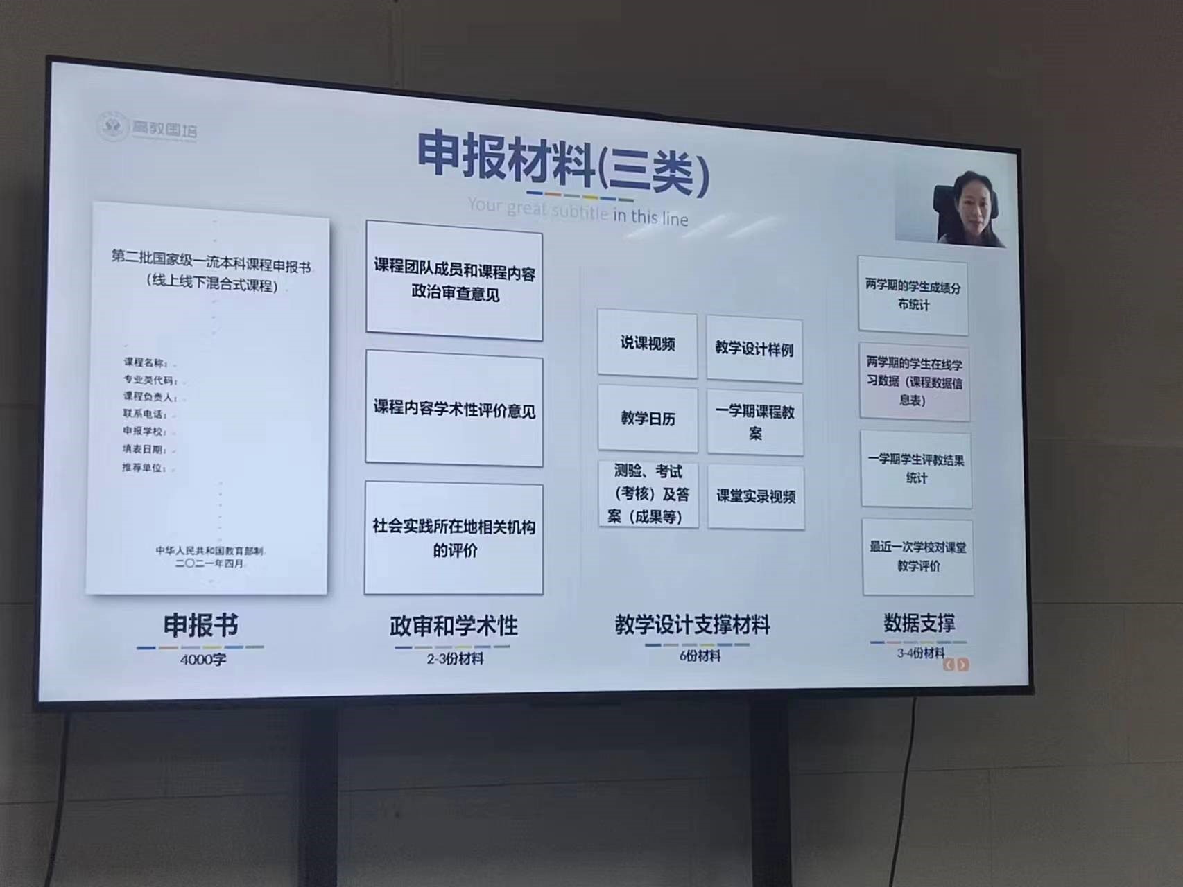 本次研讨会组织专任教师观看北京大学在线课程项目负责人、多门国家精品在线开放课程参与者和负责人、首批国家级线上一流本科课程负责人冯菲教授关于《以学生为中心在一流课程建设中的实践——线上金课申报经验分享》的线上视频,主要介绍了慕课设计与制作方法,以及申报线上国家级一流课程的经验和注意事项,并通过案例进行经验分享。