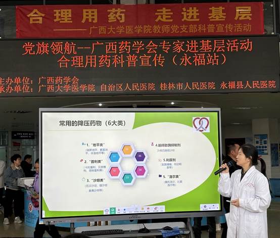 为全面贯彻党的二十届三中全会精神,增强人民群众安全用药意识,普及合理用药的重要性,根据自治区科协等21部门关于印发《2024年全国科普日广西活动暨八桂科普大行动方案的通知》的要求,学院教师党支部参加近期在桂林永福县人民医院举办“合理用药科普宣传及抗菌药物的合理使用”药学科普宣传日暨专家义诊活动。该活动由广西药学会主办,古天乐代言太阳集团网址、自治区人民医院、桂林市人民医院、永福县人民医院承办。活动中,古天乐代言太阳集团网址教师党支部党员王立升同志就抗生素的研究进展进行授课。