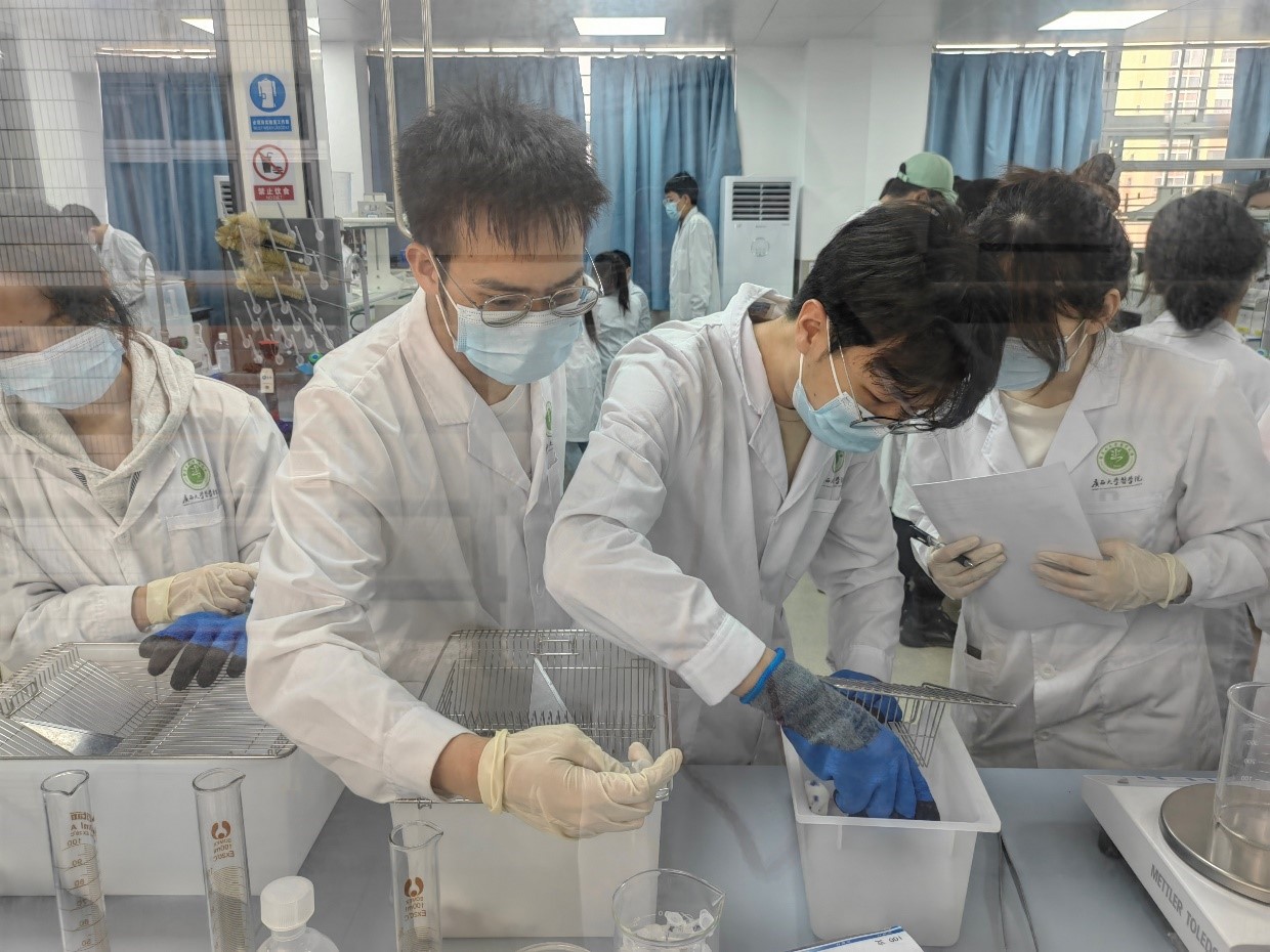 学生在广西大学医学院实验楼进行药理学实验课的实验操作