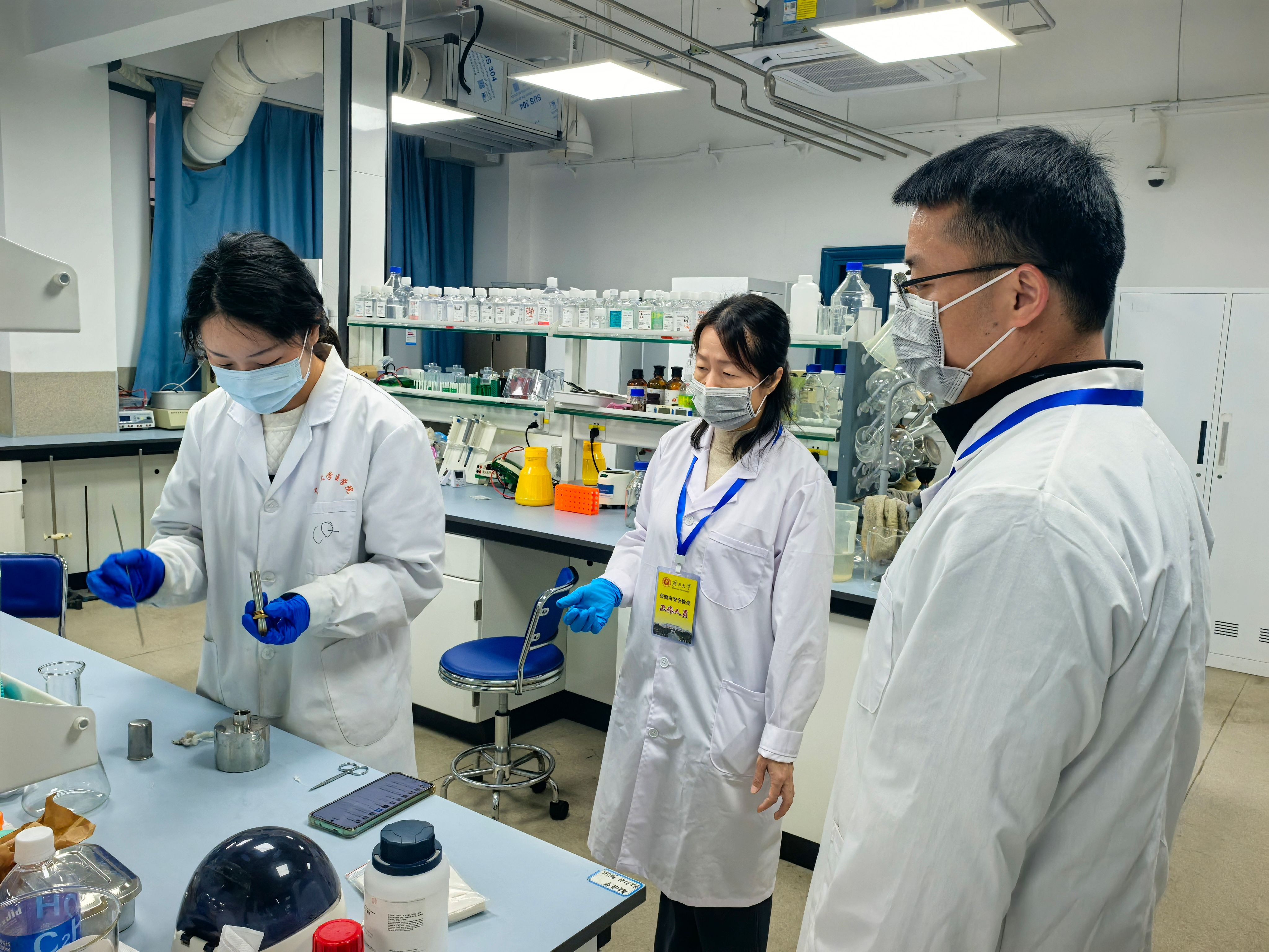 检查组分两组分别检查了科研实验室、本科实验教学实验室以及危化品存放室等重点区域,详细查看了实验设备运行、危化品存储、消防设施、应急设施、用电安全及实验操作规范等情况。检查过程中,学院领导与实验室师生进行了深入交流,了解学生的科研、学业情况及在实验室安全管理方面存在的困难,并对发现的安全隐患提出了整改要求。
