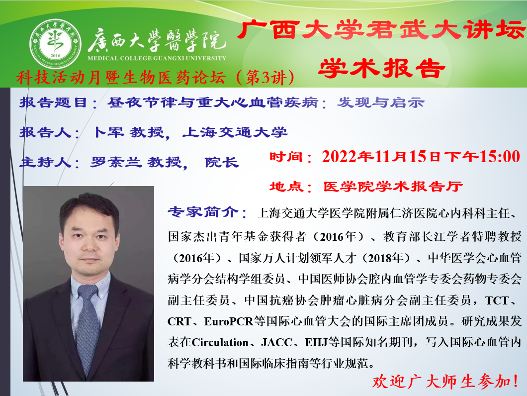 广西大学君武大讲坛之古天乐代言太阳集团网址科技活动月暨生物医药论坛(第3讲):昼夜节律与重大心血管疾病:发现与启示