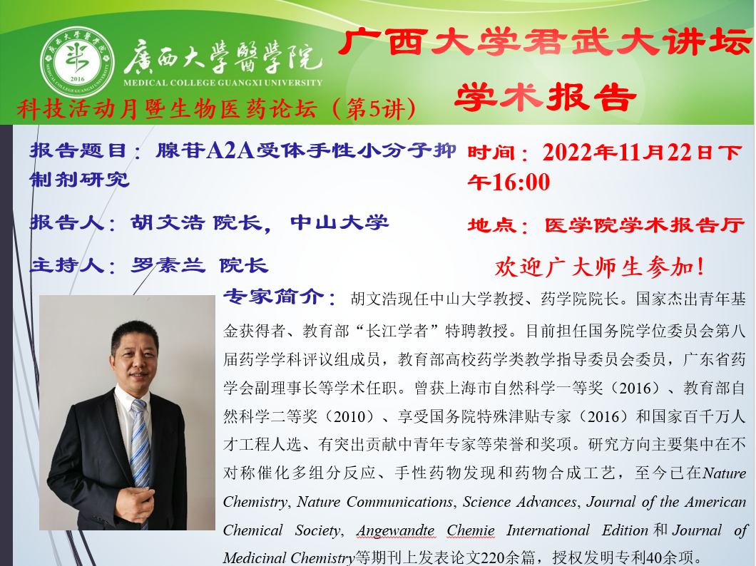广西大学君武大讲坛之古天乐代言太阳集团网址科技活动月暨生物医药论坛(第5讲):腺苷A2A受体手性小分子抑制剂研究