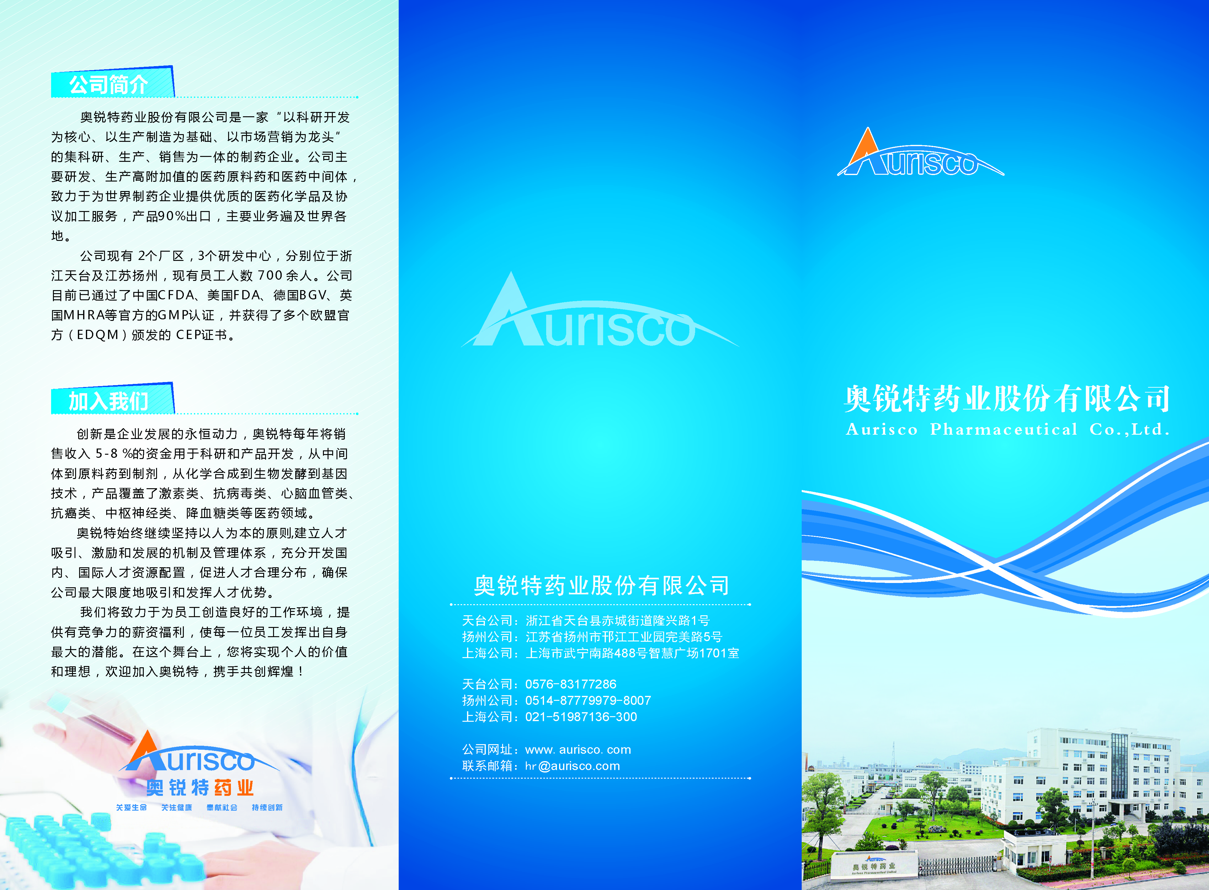 奥锐特药业股份有限公司是一家“以科研开发为核心、以生产制造为基础、以市场营销为龙头”的集科研、生产、销售为一体的制药企业。公司主要致力于为世界制药企业提供优质的医药化学品机协议加工服务,研发、生产高附加值的医药原料药和医药中间体,产品90%出口,主要业务遍及世界各地。